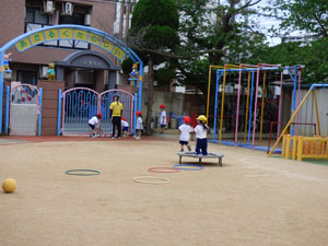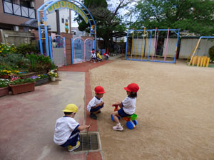 年少さんはお外遊びが大好きです。お砂場や滑り台、ダンゴムシ探しと、夢中になって 今日も遊んでいました。たくさん遊んでいっぱい汗をかくので、水筒のお茶がすぐに なくなってしまいます。毎朝水筒は満タンでお願い致します♪