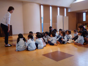 木曜日は専任の講師によるリトミックがあります。年少さんは入園後初めてのリトミックです。 はだしでピアノのリズムの音に合わせて歩いたり、止まったりしました。慣れてきたら ちょこちょこ歩きやゆーらゆーらと身体を揺らしました。 次にカードを見て、「みかん」「りんご」と言いながら手をたたきました。楽しかったようです。