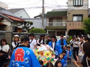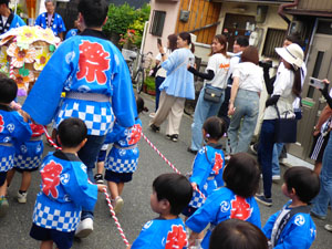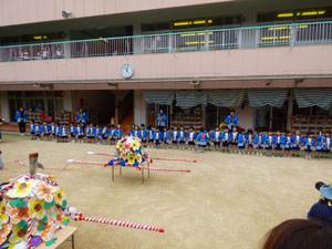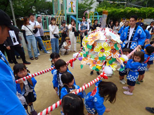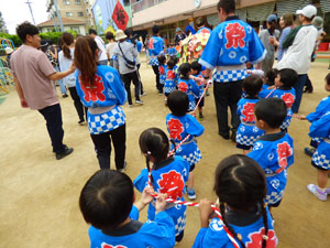 今日は年少さんが楽しみにしていたおみこし巡行でした。この日の為にお歌も手拍子も 一生懸命練習しました。おうちの人が見守ってくれる中、無事に園外を巡行することが出来ました。 小さなハッピ姿もとても可愛かったですね。 お手伝いのお父さん、見に来て下さった保護者の方々ありがとうございました。 (保護者の方々からのアンケートは、保護者の皆様からの声のコーナーに掲載していますのでご覧ください。)