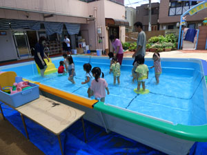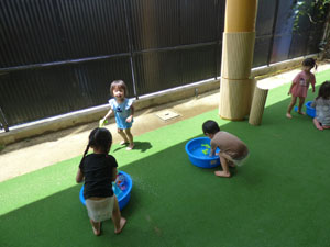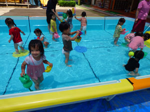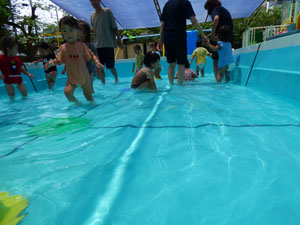 たんぽぽさんもプールに入りました。たんぽぽさん用に水深を浅くしたので怖くなかったようです。 皆でハイハイ歩きに挑戦したり、沈んだスーパーボールを拾って楽しみました。 園庭のナスも育ってきました。