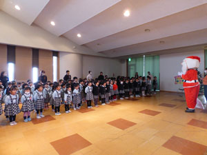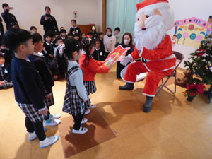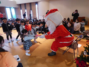 2学期の終業式でクリスマス会を行いました。サンタさんがやって来て、みんなにプレゼントを