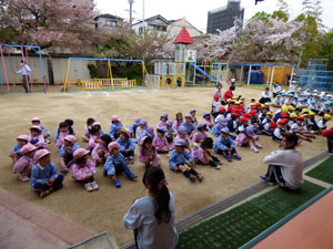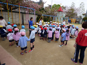 更新が遅くなって申し訳ございません。少し前の出来事ですが、おはじまりをした後に、 おならび(集団登降園)のお友だちが歩く練習をしました。お兄さん、お姉さんに 手を繋いでもらって歩きました。最後は年長さんの外遊びで玉入れをした様子です。