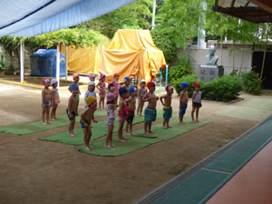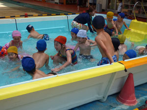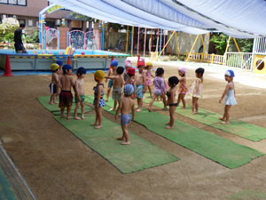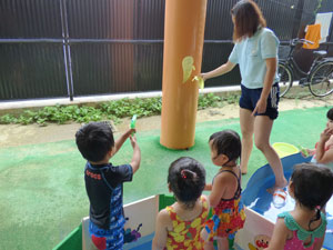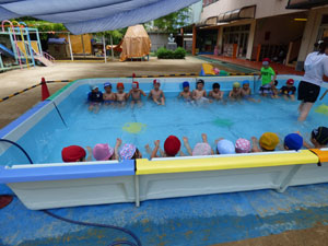 7月10日より毎日プールに入っております。連日暑い日が続いておりますので、 子どもたちは楽しそうです。当園は園庭に大きなテントを張っていますので、 プールは日陰になり涼しく入ることが出来ます。