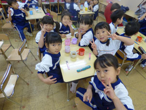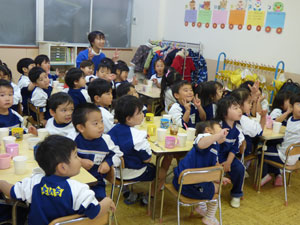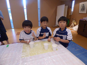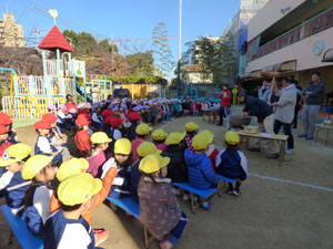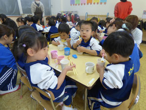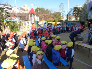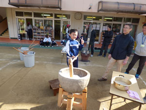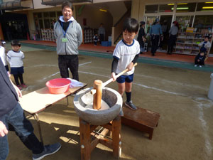 12月2日(土)にお餅つきがありました。先生からお餅の説明を受けた後にお手伝いのお父さんが ついてくれたお餅を園児全員でこねて、1人ずつきなこ餅にして頂きました。 お父さん、お母さん方のお手伝いの元、楽しくお餅つきができました。