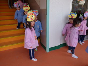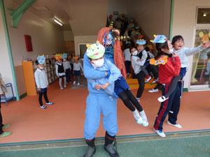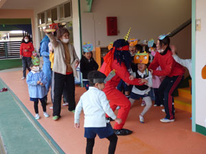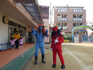 豆まきの続きです。園庭に青鬼と赤鬼が来ていました。「悪い子はいるかなー」と探していました。