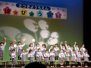 2月3日にさつき幼稚園発表会がクレオ大阪南のホールで行われました。 まずは年少さんの可愛らしい演技です。楽器あそびと歌とお遊戯です。 大きなホールでも練習通りにしっかり演じきることが出来ました。 年少さんらしく、かわいく元気一杯でした。 (保護者の方々からのアンケートは、保護者の皆様からの声のコーナーに掲載していますのでご覧ください。)