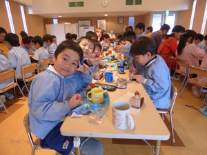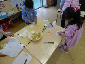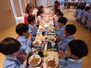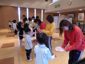 3月9日に年長さんはお別れパーティーをしました。自分たちで野菜を切って、 先生とカレーを作り、みんなでカレーを食べました。その後ドッジボールをしました。 最後にホールで先生たちに歌を歌ったり、今まで遊んだりお世話してくれてありがとうと お礼をしました。感動的なパーティーとなりました。