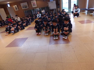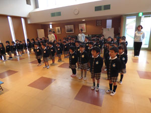 4月9日(月)に始業式が行われました。新しい年少、年中のお友だちが、 年中さんと年長さんと対面しました。年中、年長さんが新しいお友だちにお歌を歌いました。 とっても元気に歌ってくれました♪まだ泣いている子もいますが、 幼稚園は楽しいところなので少しずつ慣れていきましょうね。