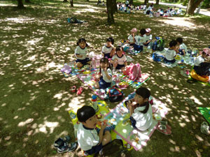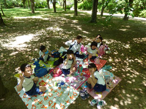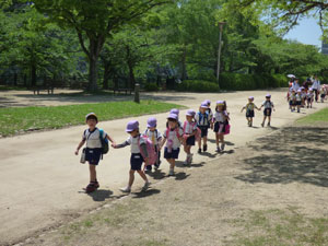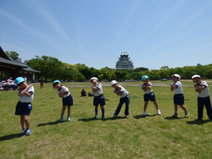5月11日(金)に年中さんと年長さんは大阪城西の丸庭園まで春の遠足に行きました。 とても良いお天気で、電車に乗ってしっかり歩きました。 リクリエーションをして走ったり競ったり、大人数でおにごっこしたり、 輪になって踊って歌ったりしました。みんなでお弁当を食べました。楽しい遠足となりました。
