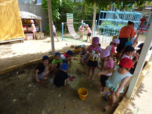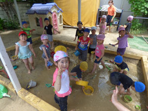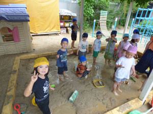 6/1(金)に年中組(ふじ、もも)はお砂場にお水を入れてどろんこを作って、 その中で遊びました。思い切り泥に入って遊ぶ子や泥の感触が 嫌なのかなかなか入らない子など様々でした。普段できないことなので、楽しく遊べました。
