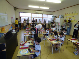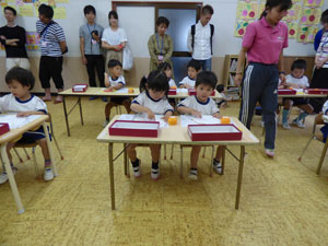 6月10日(日)の日曜参観の様子です。普段幼稚園に来られない、お父さん、おじいさん、 おばあさんに保育の様子をみてもらいました。子どもたちは恥ずかしそうにしていましたが、 嬉しそうな様子でした♪ (保護者の方々からのアンケートは、保護者の皆様からの声のコーナーに掲載していますのでご覧ください。)
