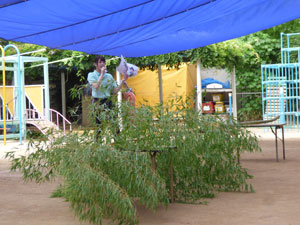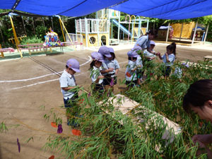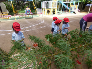 7月2日に七夕飾りの飾りつけを行いました。 幼稚園の竹を1本切り、そこに手作りの飾りを全員付けました。年少さんはかた結びが まだできないため先生に手伝ってもらいました。終わってから教室でカルピスを飲みました。