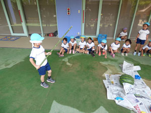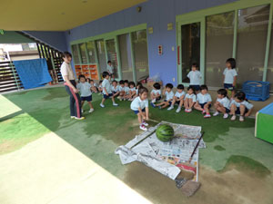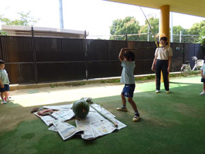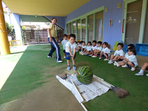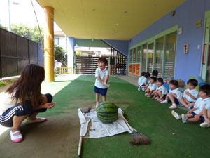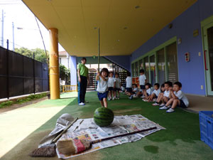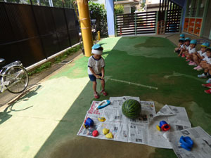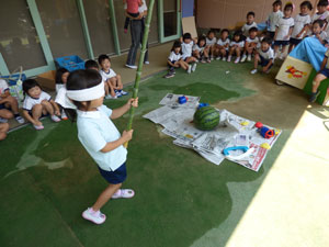 卒園児の保護者様から頂いたスイカですいかわりをしました。学年毎に一つのスイカで行いました。年長さんのみ目隠しをして3回まわってからやりました。目隠しをすると皆に教えてもらいながら、ゆっくり前に進んでスイカをばちんと叩いていました。 年中さん、年少さんは目隠し無しでしました。しっかりとしたスイカでなかなか割れません でしたが、子どもたちは大盛り上がりでした。スイカは後でみんなでおいしく頂きました。