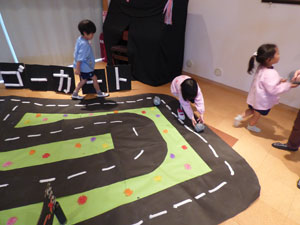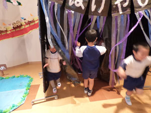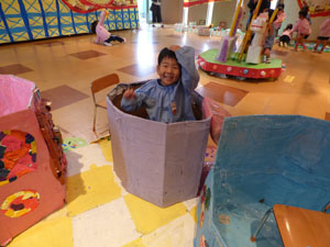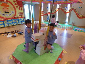 作品展が終わり、ホールには製作物が残っていましたので、今週の保育時間にホールの製作物で 子どもたちは遊びました。おばけやしきに入ったり、魚釣りをしたり、 メリーゴーランドのお馬さんに乗ったり思い思いに楽しみました♪楽しい一時を過ごしました。