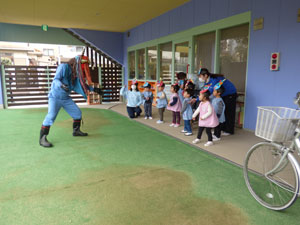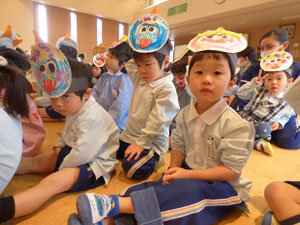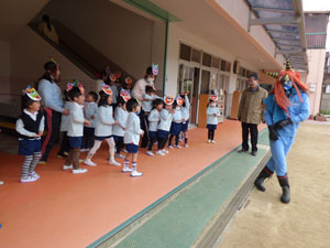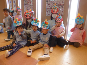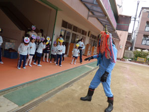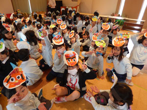 1月28日に一足先に豆まきをしました。ホールで節分や豆まきのお話を聞いた後、 園庭を見ていると幼稚園に青鬼が来ていました。「ヒエー」と逃げ出す子ども、 豆を当ててくる子ども反応は様々でした。心の中の鬼も追い出しましょうね(^-^)