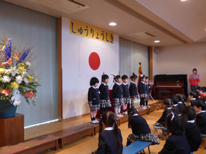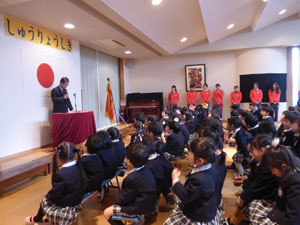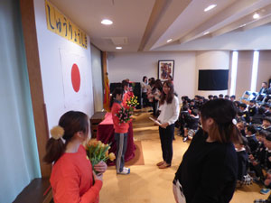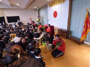 3月19日に終了式を行いました。皆勤賞、出席優良などの子どもが呼ばれて前に立って 誉めてもらいました。その後、保護者の方々より各担任の先生にお花を頂きました。 1年間のお礼をして頂きました。温かい雰囲気の終了式となりました。 最後に来年度のクラス発表もありました。