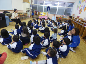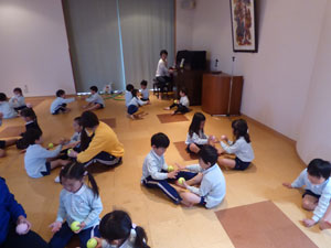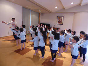 4月の英語とリトミックの様子です。どちらも正課に行う授業です。写真は教室で行っているのが 英語で年少さんです。ホールで行っているのが、リトミックで年長さんです。 今年度も正課の教室を元気に受けて学んでいってほしいです。