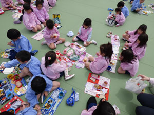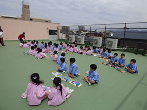 4月17日に年長の2クラスは屋上でお弁当を食べました。屋上に色々はお弁当が並んでいました。これから暑くなるので、このような試みも過ごしやすい今だけですね。