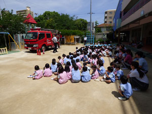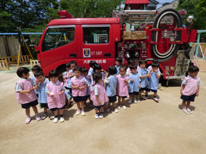 5/27(月)に消防署の職員の方々と消防車が来て、避難訓練をしました。