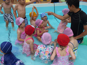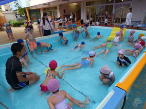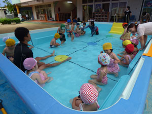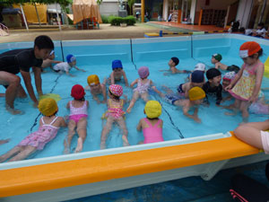 プールが園庭に設置されました。7月9日の体操の時間のプールの様子です。 水に慣れることからはじめて、水かけっこしたりワニさんになって水につかったりしました。 これから毎日プールに入りますよ♪