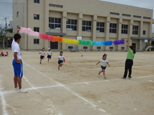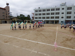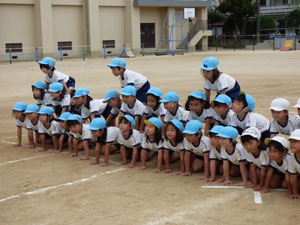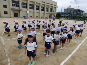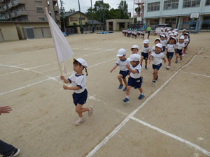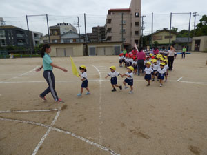 9/24(火)に運動会のリハーサルを今川小学校の校庭をお借りして行いました。 入場行進から開会式、閉会式を行い、年少、年中はダンス、年長はオープニングと組体操。 全学年でかけっこを行いました。涼しい日でとてもやりやすかったです。 広い校庭でしたが、元気に楽しく行えました。