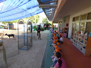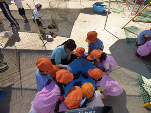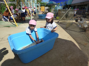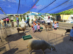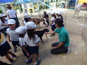 9/26(木)に雨で延期になった移動動物園が行われました。 園児は全員ポニーに乗せてもらいました。やぎや羊、犬、アヒル、かめ、ひよこ、にわとり、 うさぎ、モルモットと様々な動物たちと触れ合い、とても楽しい時間を過ごせました。 なかなかここまで近くで触れ合うことは無いため子ども達も大喜びでした。 最後に近隣の未就園児のお友だちも遊びにきました。