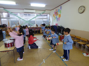 年中の発表会の練習の様子です。楽器遊びとダンスの様子です。教室から大きな音がなっています。段々とリズムがよくなっています。ダンスもだいぶ振付を覚えて上手になってきました♪