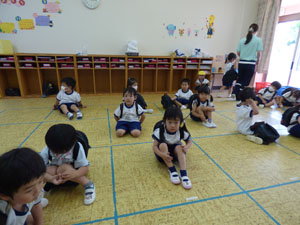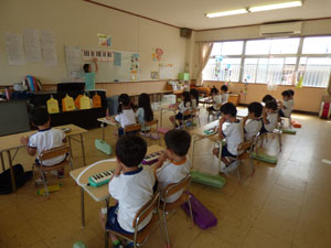 年長の鍵盤ハーモニカ、未就園児クラスたんぽぽの園庭遊び年少のお帰りの時間の様子です。