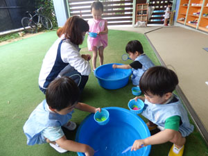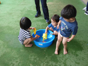 7月の未就園児のたんぽぽ組の様子です。今年はプールの代わりに水遊びをしています。