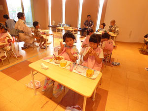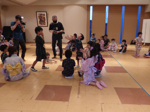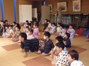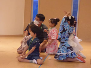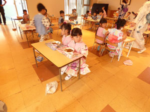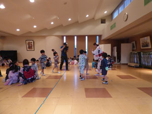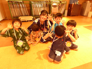 今年はお泊り保育が残念ながら行けませんでした。その代わりとして、年長さんで 幼稚園で7/21(火)の夕方より夕涼み会を行いました。 先生も子どもも浴衣やじんべいを着てきました。夕方の幼稚園とみんなの衣装でいつもと違う 雰囲気の幼稚園♪給食のカレーを食べてから、ひらがなビンゴやクイズなどのゲームをして 先生のトーンチャイムの発表を聞きました。最後は園庭で盆踊りもできて楽しかったです。 子どもたちも先生も良い思い出ができたようです。