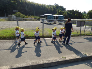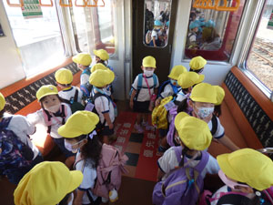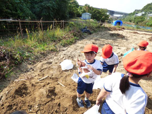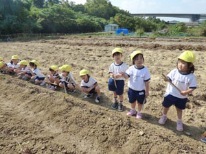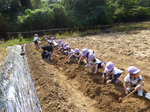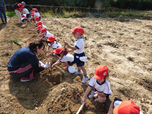 10月29日にいもほりの遠足に行きました。全員で電車に乗って、駅からは年少さんはバス、 年中さん、年長さんは歩きで向かいました。土は硬かったけど一生懸命掘りました。 天気も良く楽しい遠足となりました。