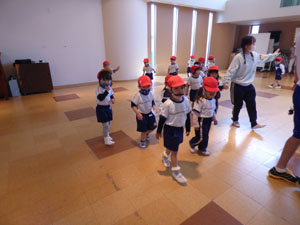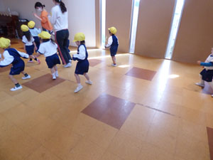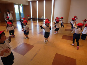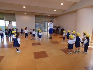 4/27に年長さんが初めての体操をしました。色々な物になったつもりで歩きました。