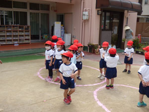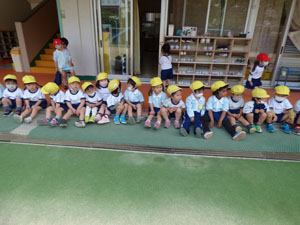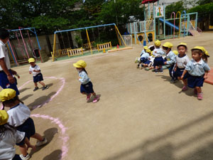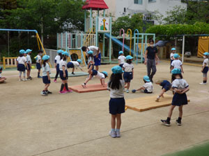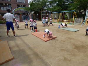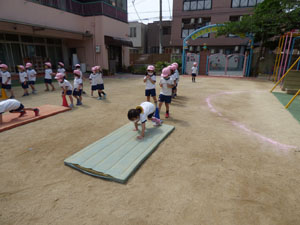 5月11日の体操の様子です。園庭で行いました。気候が良く体を動かしました。 年少さんは初めての園庭の体操でしたので簡単な運動あそびをしました。 年中さんはマットの上で四つん這い歩きをしました。