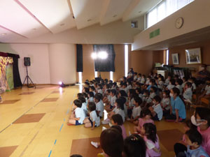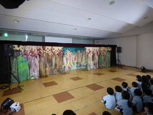 年に1回行われる観劇会を6/24に行いました。劇団バクさんがたくさんの荷物やセットを 持参してくれましてホールが劇場となり、楽しい劇を見れました。 題はヘンデルとグレーテルです。全体を2グループに分けて2公演していただきました。