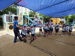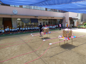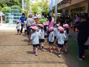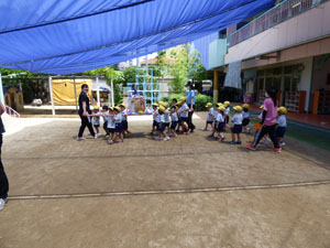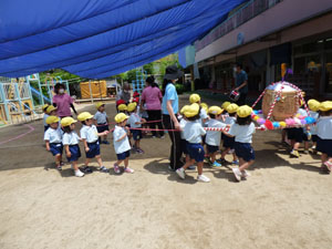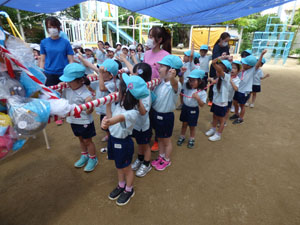 6/28のおみこし参観に向けておみこしの練習を数回しています。 今年はコロナの影響で町内は歩けませんが園庭を歩きます。1クラスで1台のおみこしを担ぎます。「わっしょい。わっしょい」と掛け声をかけて歩きました。