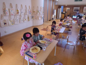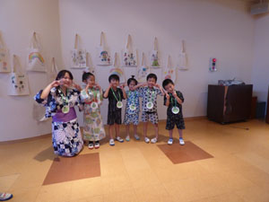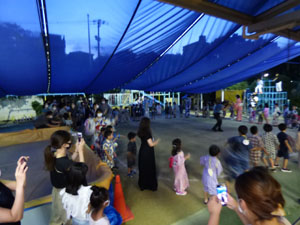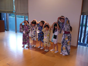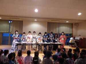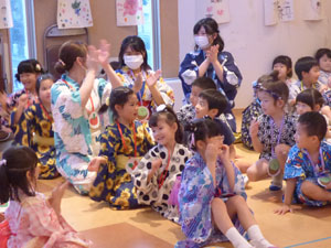 今年もコロナの影響でお泊り保育の代わりとして夕涼み会を年長組は行いました。 浴衣を着て夕方に幼稚園に集まってカレーを頂いて、ゲームやクイズ、宝探しをしてから 先生のトーンチャイムを聞きました。お外も段々暗くなっていき、最後は園庭で盆踊りをしました。楽しかったですね♪