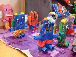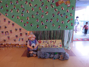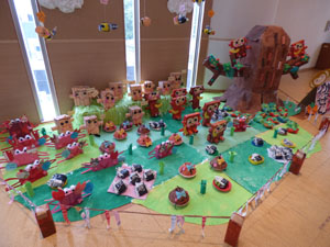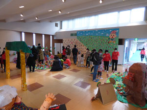 11月14日(日)に作品展を行いました。ご家族で見学に来てもらいました。 テーマは「日本の昔話」です。ホールに浦島太郎の竜宮城や桃太郎の鬼ヶ島を作りました。 (保護者の方々からのアンケートは、保護者の皆様からの声のコーナーに掲載していますのでご覧ください。)