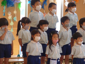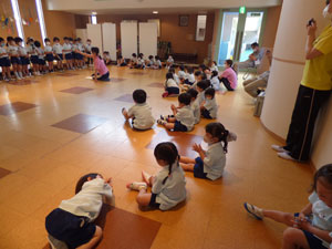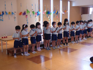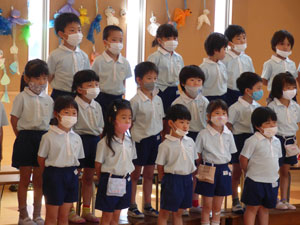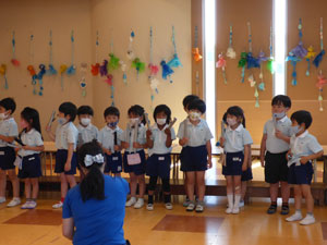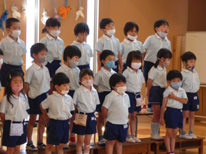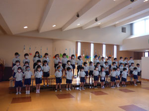 5月の初旬より6月4日の参観に向けて年長さんはトーンチャイムとハンドベルを1から覚えて 練習を重ねています。初めて使う楽器、音の出し方、鳴らし方を覚えて、 自分のパートの音の時に鳴らすという役割をこなすという年長さんだからできる楽器といえると思います。 お歌も3曲歌います。長い歌詞も覚えられるようになりました♪ この日は年少組のお客さんも来て見てもらいました。年長さんらしくしっかりしたところを見てもらっていました。
