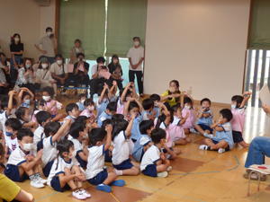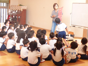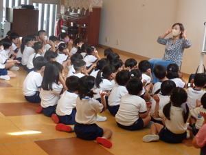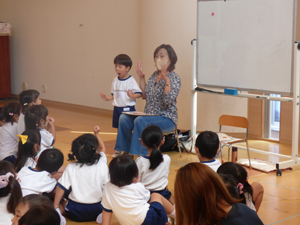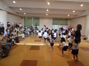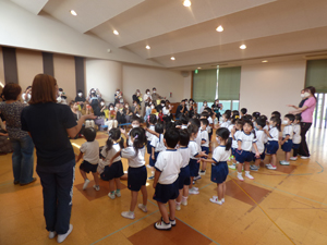 10月12日に英語参観を幼稚園のホールで行いました。 毎週水曜に行っている英語を1年に1回保護者の方に見てもらう参観です。 学年毎に行っています。 楽しく英語を学ぶ様子を見てもらえました。 (保護者の方々からのアンケートは、保護者の皆様からの声のコーナーに掲載していますのでご覧ください。)