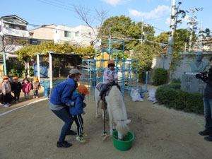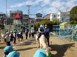 12月16日に今年も移動動物園として動物たちがさつき幼稚園に遊びに来てくれました。 今年もポニー、ひつじ、やぎ、犬、あひる、七面鳥、にわとり、ハムスター、 ねずみと多くの動物たちが来てくれました。子どもたちは餌をあげたり触れ合ったりとても 楽しんでいました。良い経験になってくれたと思います。 動物たち、飼育作業員の方ありがとうございました。