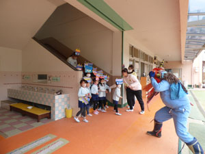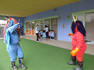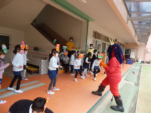 2月3日の節分の日に幼稚園でも豆まきを行いました。ホールで先生に節分のお話を聞き、 鬼さんが来た時の準備を整えていざ鬼さんと対決です。 勇気のある子は豆を一生懸命まいていました。 鬼は退散していきました♪怖かったけど子どもたち頑張りました!