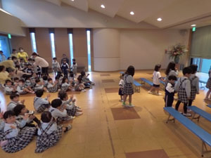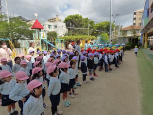 4月の初旬に 年中さん年長さんと年少さんの対面式がありました。 これから一緒に遊ぼうねとお話しました。また、園庭の方はおはじまりです。 全クラス集まって行いました。お歌を歌って先生のお話を聞いて体操をします。