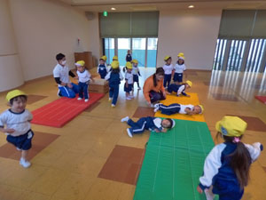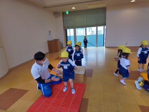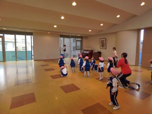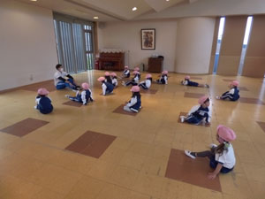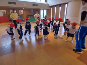 4/25(火)の体操の様子です。 この日から年少組さんも初めての体操です(赤帽子と黄色帽子です) 小雨だったのでホールで行いました。楽しくのびのびと体を動かせましたね。 毎週水曜日は体操があります。1年間体を動かしていこうね♪