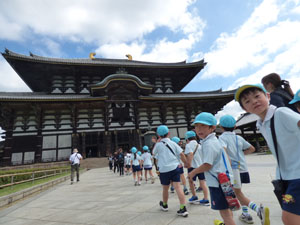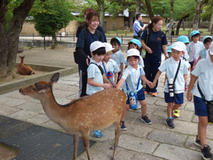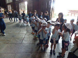 2日目は朝食を食べてからホテルとお別れをして東大寺まで歩きました。 大仏さんを見学して鹿さんたちに触れあってからバスで帰りました。 年長さんたち、楽しいお泊り保育でした。園としてはコロナで中止となっていたので 4年ぶりのお泊り保育でした。