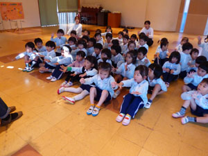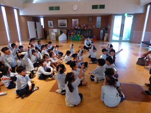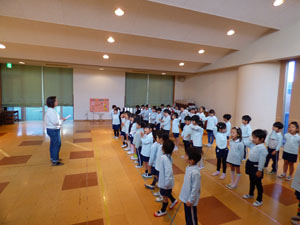 毎週水曜日は正課で、ネイティブスピーカーの専任の先生による英語あそびがあります。 今回は英語で歌ったり体を動かしたりしました。また、クリスマスプレゼントで欲しい物を 答えました。日頃から楽しく英語に親しんでいます。