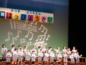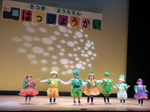 12/2(土)に、市のホールをお借りして、発表会を行いました。 まずは年少の部からスタートです。年少さんはお遊戯と楽器遊び、お歌を披露してくれました。 先生の手作り衣装を着て、堂々と踊る事ができました。初めての発表会、大きな声で一生懸命 歌う姿が、とても微笑ましかったです。見に来てくれたおうちの方々も喜んで頂いたと思います。 ありがとうございました。 (保護者の方々からのアンケートは、保護者の皆様からの声のコーナーに掲載していますのでご覧ください。)