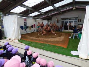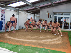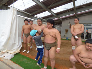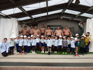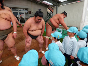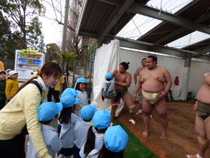 少し前になりますが3/4(月)3/7(木)と、近所で開催されていた相撲部屋の朝稽古の様子を 見学させていただきました。近くで見るお相撲さんは大きくて迫力があり、子どもたちは最初は 少し緊張している様子でした。稽古後は子どもを一人ひとり片腕でヒョイと持ち上げ優しく 話しかけてくれるなど一気に和やかな雰囲気になりました。貴重な体験が出来ました。