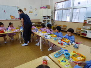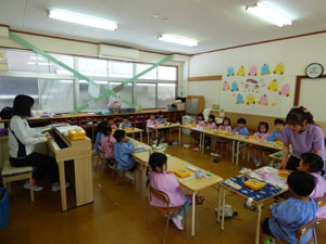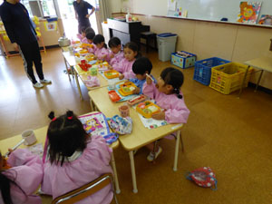 今日は年少さんにとって初めての給食でした。お友だちと同じメニューだといつもより食欲が わきますね。「給食の歌」「神様は」を歌った後、皆でいただきますをします。 「コックさんが作ってくれたごはん」「これお芋かな?甘くておいしい」など、 いつもとは違う味も美味しいと感謝しながらいただく事が出来ました。完食した後は 先生お手製のおにぎりをおかわりする子もいました。たくさん食べてたくさん遊ぼうね♪