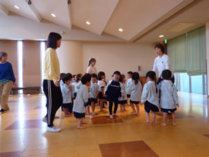 木曜日は専任の講師によるリトミックがあります。年少さんは入園後初めてのリトミックです。 はだしでピアノのリズムの音に合わせて歩いたり、止まったりしました。慣れてきたら ちょこちょこ歩きやゆーらゆーらと身体を揺らしました。 次にカードを見て、「みかん」「りんご」と言いながら手をたたきました。楽しかったようです。