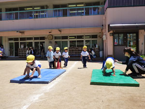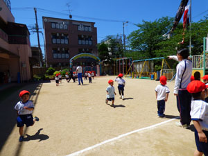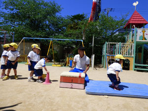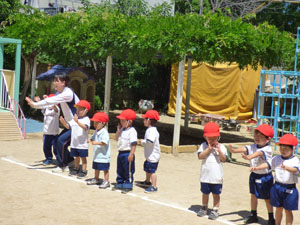 年少さんは、「園庭」では初めての体操でした。体操の先生が大好きで、皆しっかりお話を